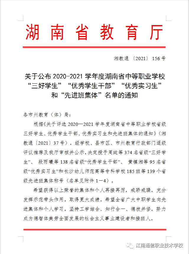 經(jīng)學校評議、推薦,岳陽市教育局、湖南省教育廳審核評定2020-2021學年度湖南省中等職業(yè)學校“省級三好學生、優(yōu)秀學生干部、優(yōu)秀實習生、先進班級體”評選結(jié)果新鮮出爐!