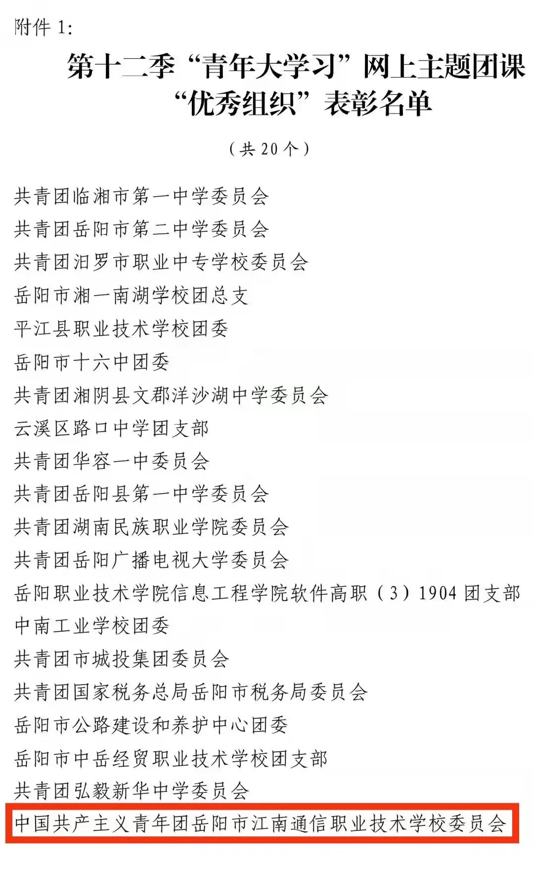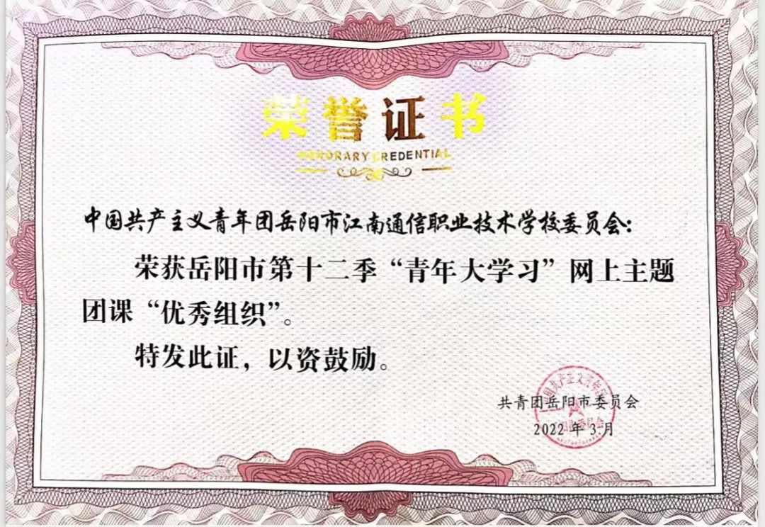 近日,從共青團(tuán)岳陽市委員會(huì)傳來消息,我校榮獲岳陽市第十二季“青年大學(xué)習(xí)”網(wǎng)上主題團(tuán)課“優(yōu)秀組織獎(jiǎng)”。